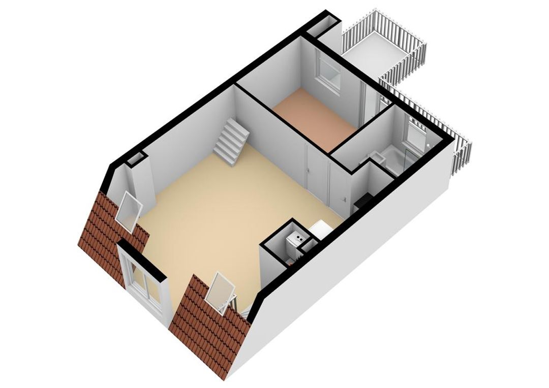 You reach the entrance of the apartment on the third floor. Through a staircase to the fourth floor you enter the living room with the open kitchen which is equipped with various appliances. At the back of the flat you will find the spacious bedroom with balcony/roof terrace and the bathroom which is equipped with a bath, toilet and sink. Through a staircase there is access to a spectacular roof terrace (28m2), where you have a beautiful view over the city.
