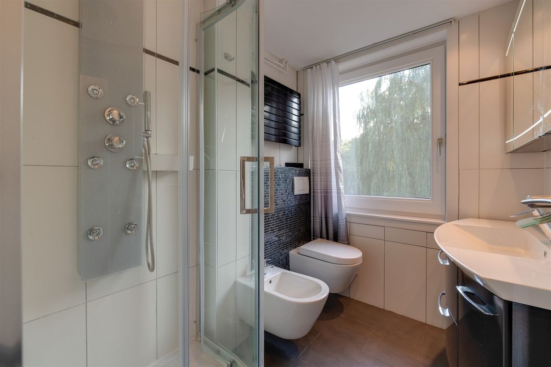 At the front you will find a very spacious bedroom with large windows and bathroom with walk-in shower, sink, toilet and bidet.