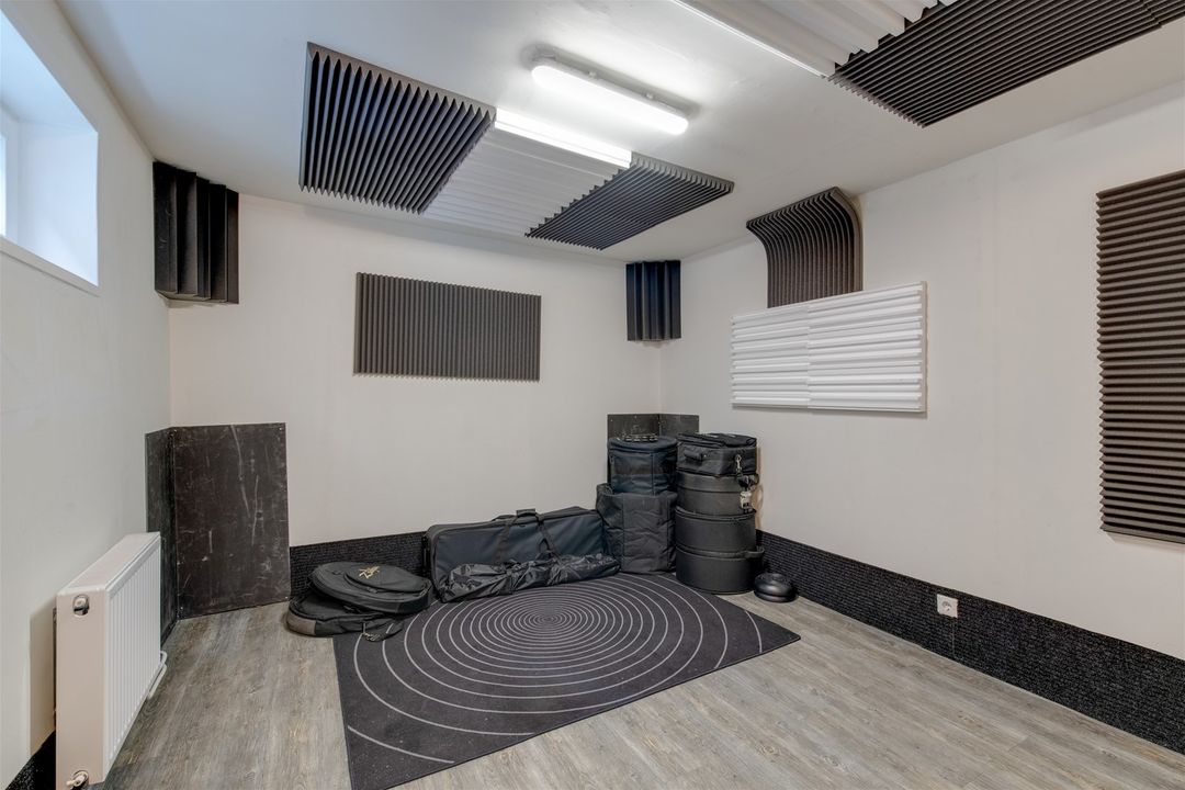 Through the living you enter the backyard which is equipped with an studio. The studio is fully insulated, sound-absorbing and is equipped with electricity and heating.